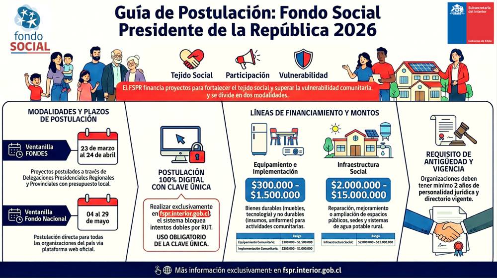 La Subsecretaría del Interior, a través del Departamento de Acción Social, informa la apertura del proceso de postulación 2026 del Fondo Social Presidente de la República, iniciativa que financia proyectos impulsados por organizaciones sociales y entidades sin fines de lucro para fortalecer el tejido social y contribuir al desarrollo de las comunidades.